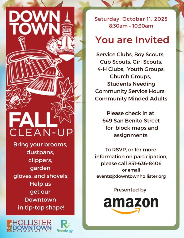 For more information or to participate call 831-696-8406 or email events@downtownhollister.org