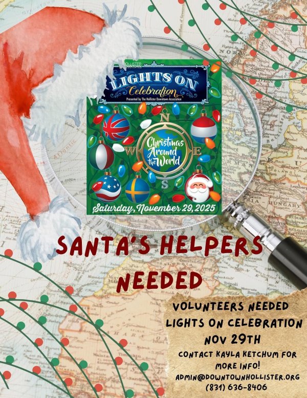 Santa is coming soon! If you would like to be a part of the 2025 Lights On Celebration, please contact us for volunteer opportunities! Please call or email Kayla at the Hollister Downtown Association office: 831-636-8406 or admin@downtownhollister.org